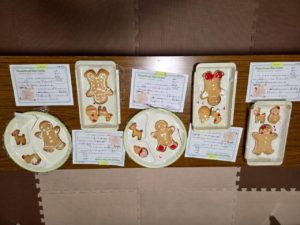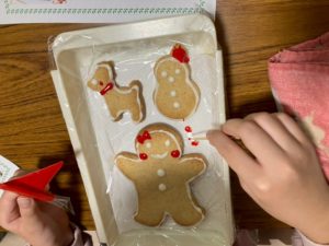 今年は、わたし(Maki)が13センチ位の高さの大きなジンジャーブレッドマンのクッキーや、小さいトナカイ、雪だるま、結晶、ブーツなどのクッキーを焼いて、その上に子ども達が白や赤や緑色のアイシングでお絵かきして、デコレーションしていきました。